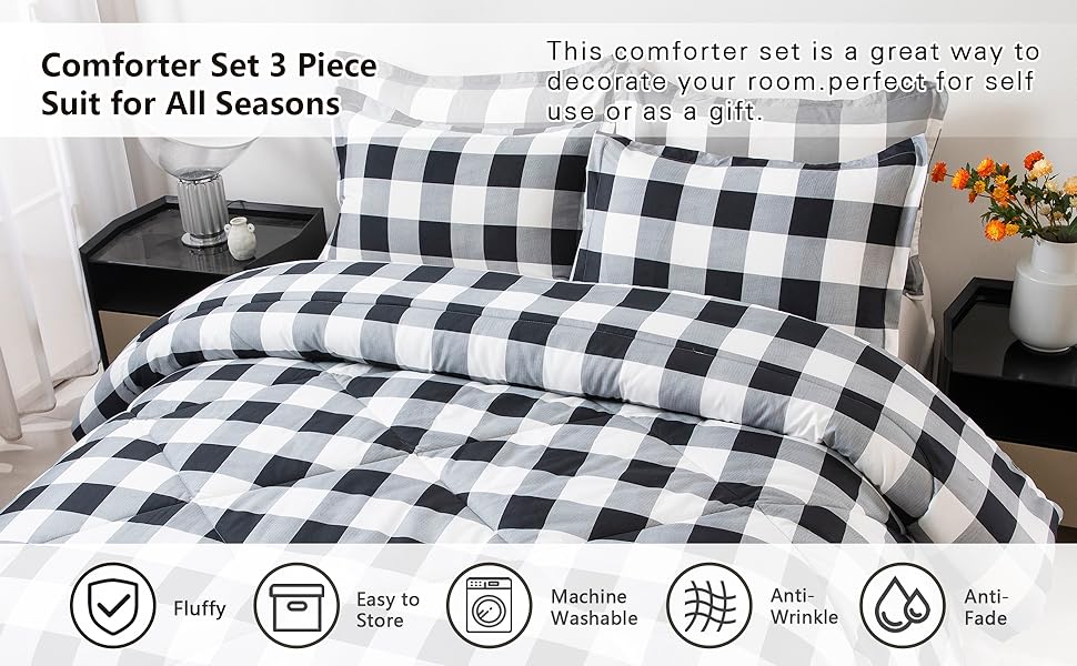 ⭐Full Size Comforter Set:The black plaid comforter set comes with 3 pieces, there is 1 full black white gray plaid comforter (79"x90") and 2 pillow cases (20"x26"). The full size buffalo checked comforter can be used as a duvet insert or as a stand-alone comforter. Suitable for use in all seasons and in air-conditioned rooms.